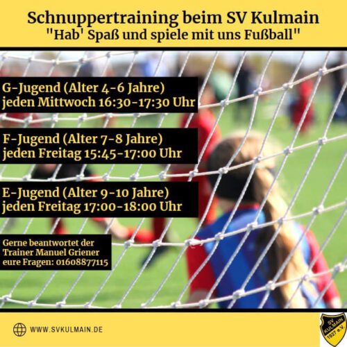 Der SV Kulmain bietet am Mittwoch, 23. Juni 2021 wieder ein Schnuppertraining für Kinder und Jugendliche zwischen 5 und 18 Jahren an. Es wird um Anmeldung unter Telefon 0171/1821623 gebeten. Die Startzeit wird noch rechtzeitig, je nach Anzahl der Teilnehmer, bekanntgegeben. Für das Schnuppertraining hat der SV Kulmain neue Kinderbälle und Trainingsutensilien angeschafft, um optimale Trainingsbedingungen zu bieten.