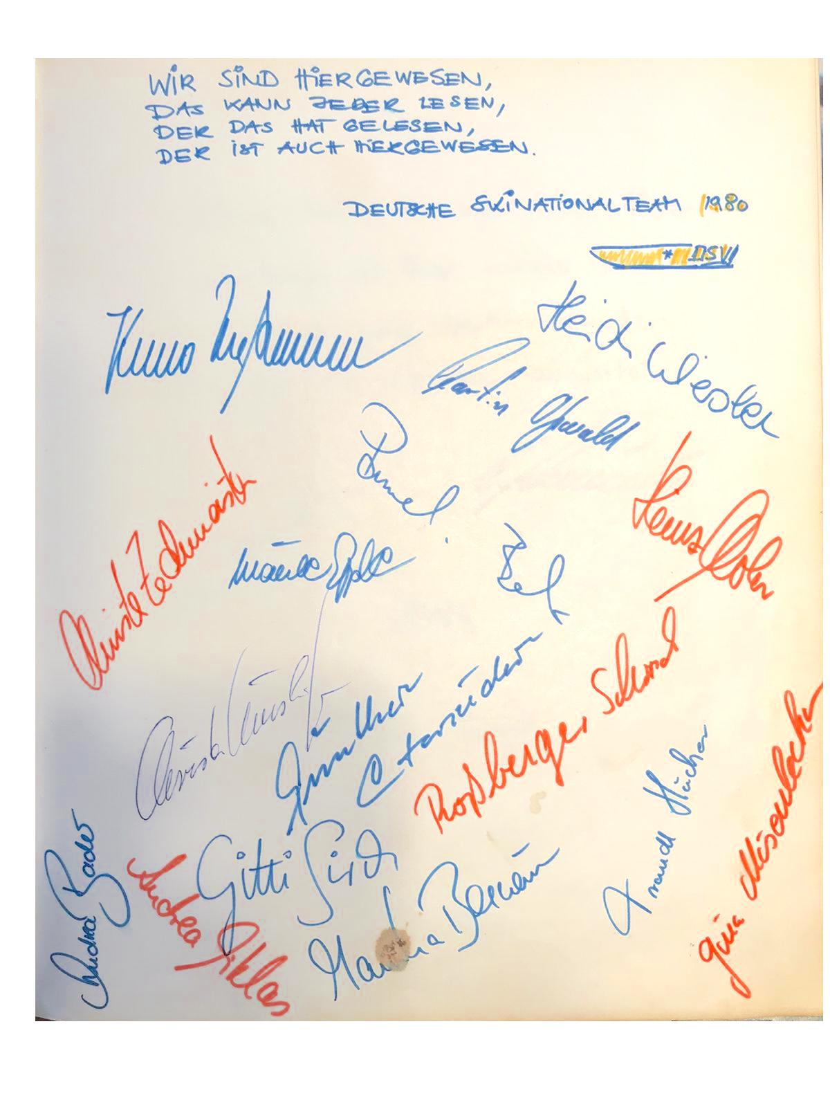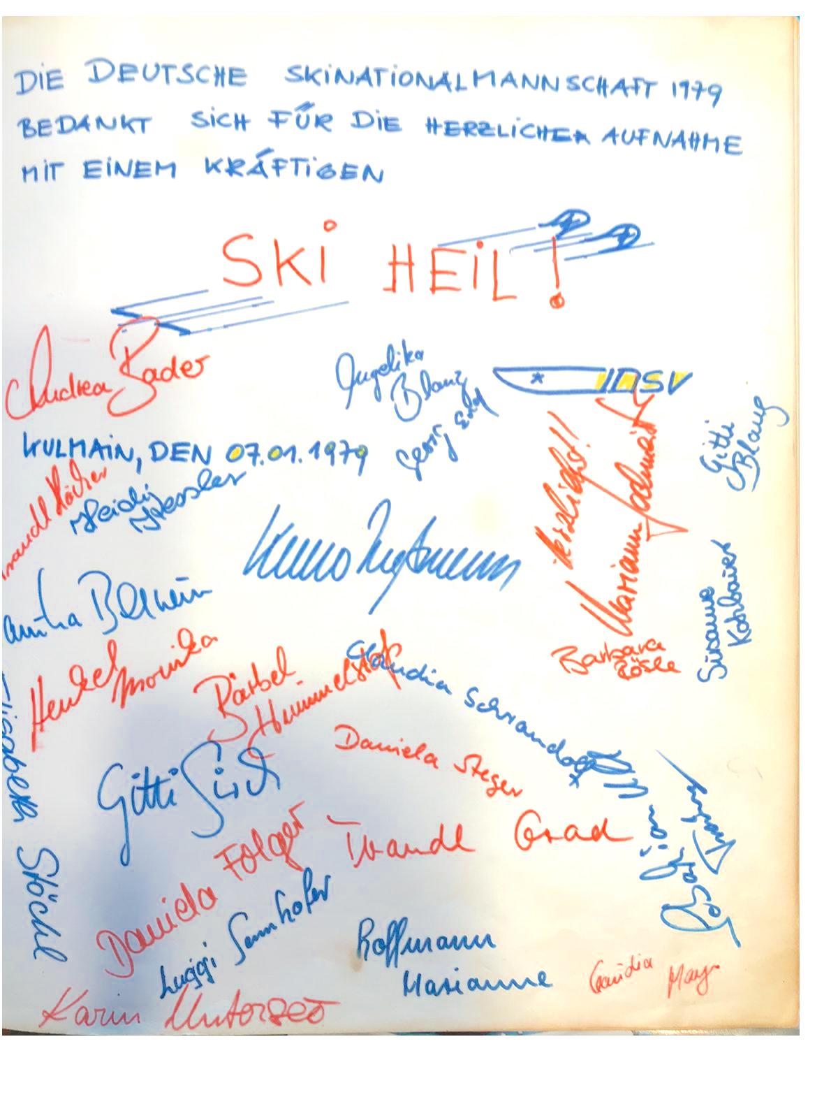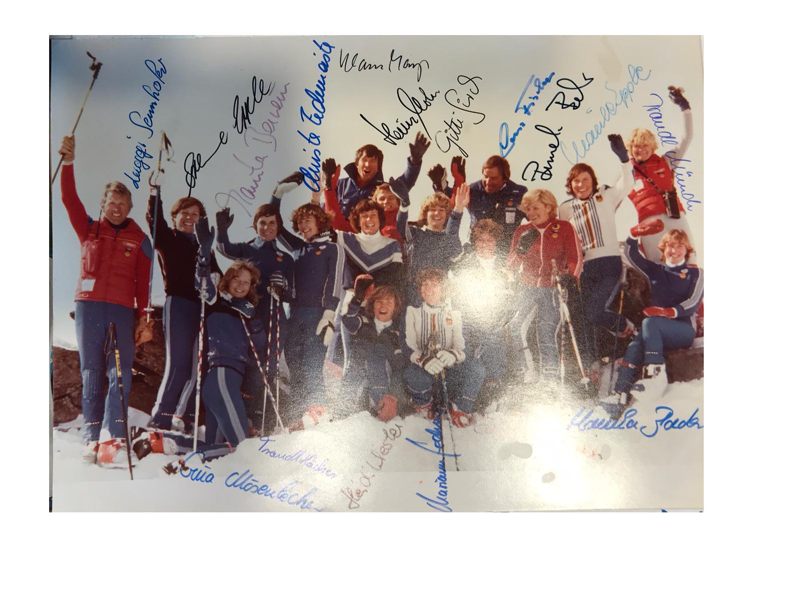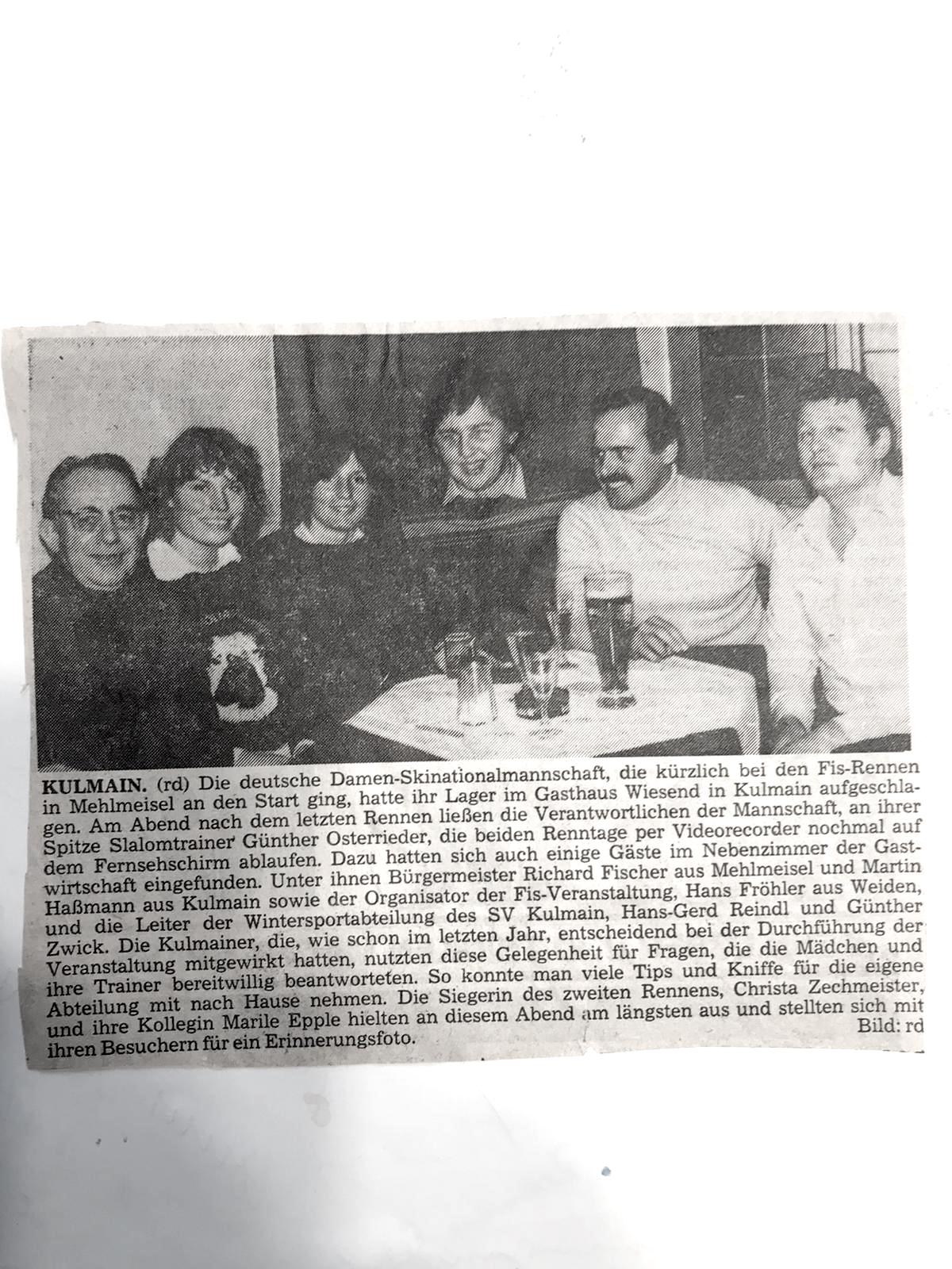 Die Verantwortlichen der Deutschen Damen-Skinationalmannschaft wählten in beiden Jahren den Hotel-Gasthof Wiesend als Quartier für ihre jungen Damen, unter denen sich die auf dem Bild dargestellten Maria “Marile” Epple (verh. Epple-Beck und Schwester von Irene Epple-Waigel, Bild 2.v.l.) und Christa Zechmeister (Siegerin des Riesenslaloms 1980 in Mehlmeisel, Bild 3.v.l.)) befanden.