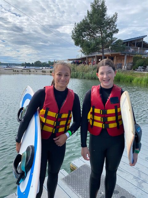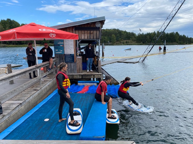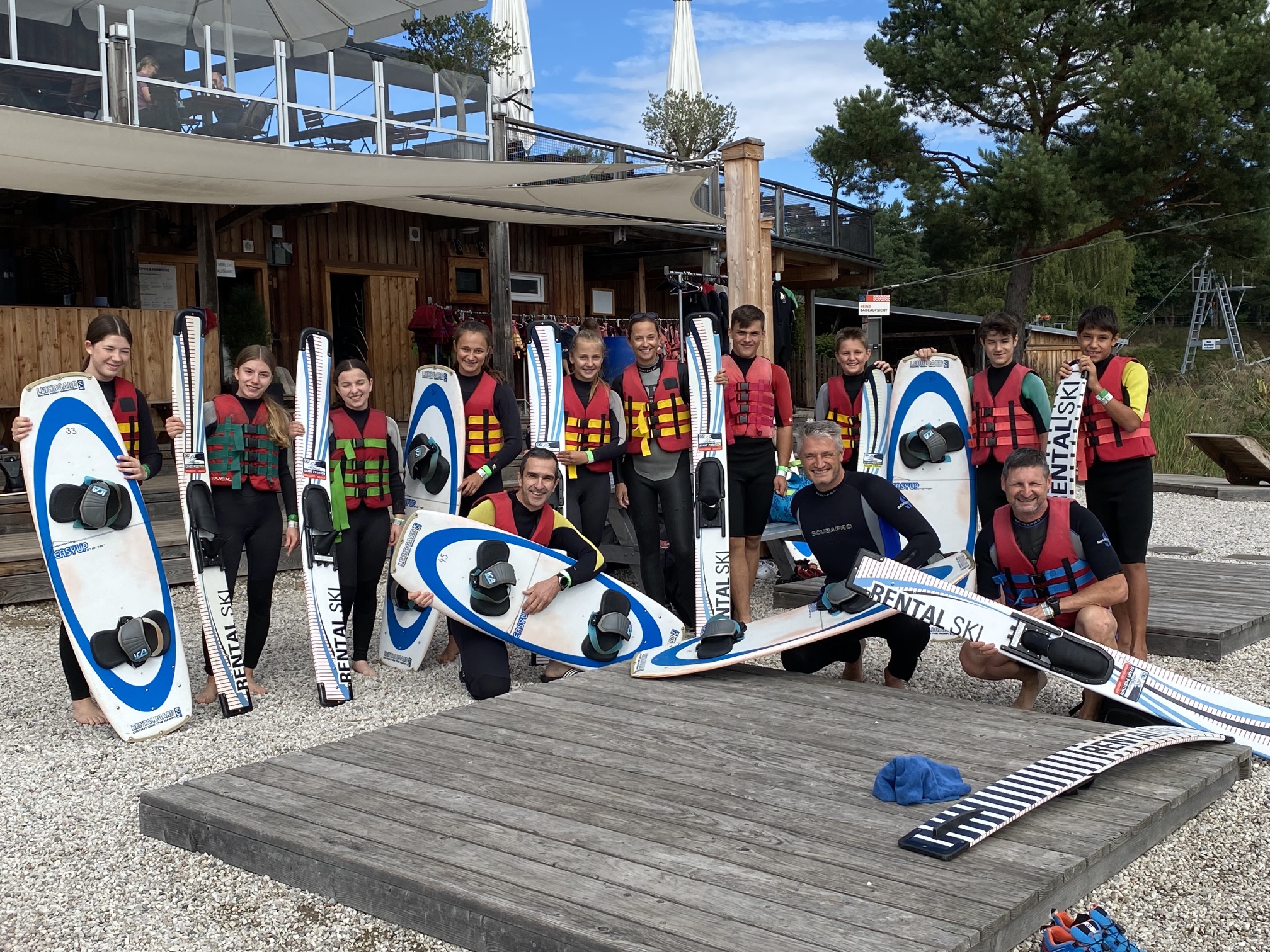 Bis kurz vor Abfahrt am letzten Ferien-Freitag lag die Durchführung der Wintersportaktion noch etwas im Unklaren aufgrund der durchwachsenen Wettervorhersage. Trotzdem entschieden sich neun Kinder aus der Gemeinde und vier Übungsleiter der Wintersportabteilung zum Wildwake-Park am Steinberger See aufzubrechen. Anfangs etwas frisch, aber Wasser- und wetterfest ausgerüstet mit Neopren-Anzügen freuten sich alle mächtig auf gut 2 1/2 Stunden Wakeboarden und Wasserski. Auch Petrus zeigte sich von seiner besten Seite und spendierte den Kids bei leicht bewölktem Wetter mit vielen sonnigen Abschnitten und Temperaturen um 20°C einen herrlichen Vormittag.