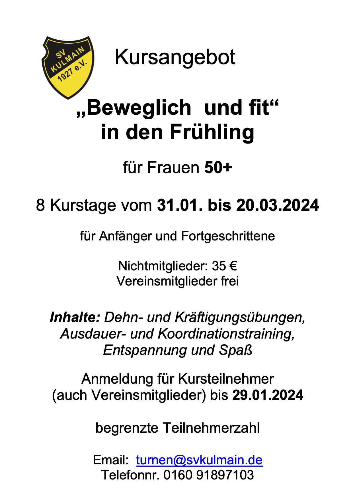 Die Teilnahme von SV-Vereinsmitgliedern ist frei. Alle Anmeldungen (auch der SV-Mitglieder) sind bis zum 29. Januar per Email an turnen@svkulmain.de oder telefonisch an 0160 91897103 zu richten.