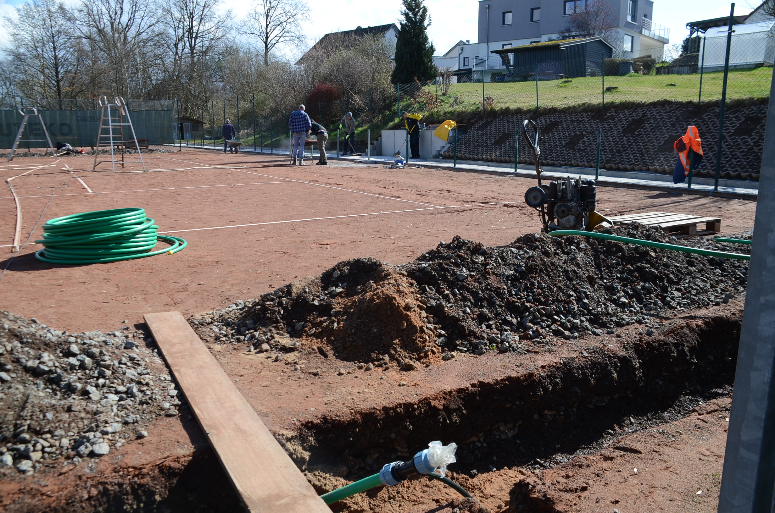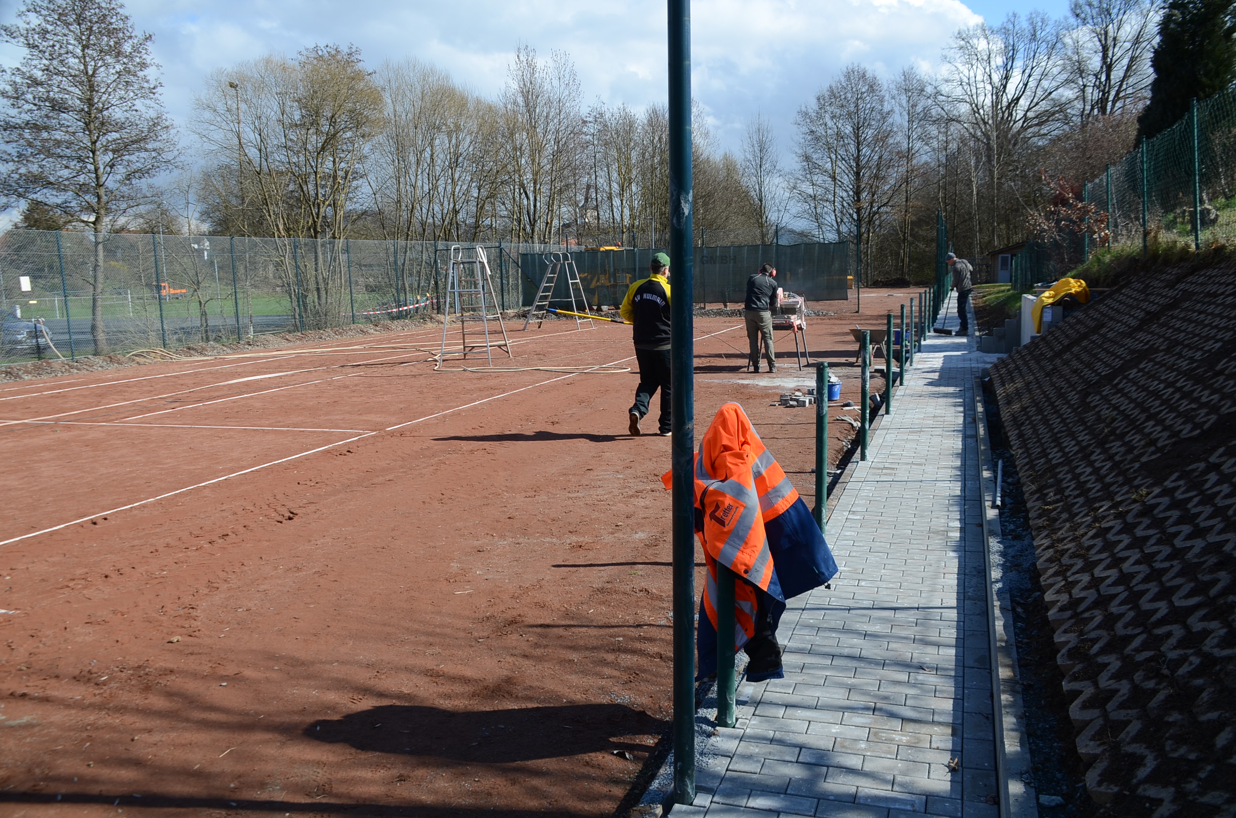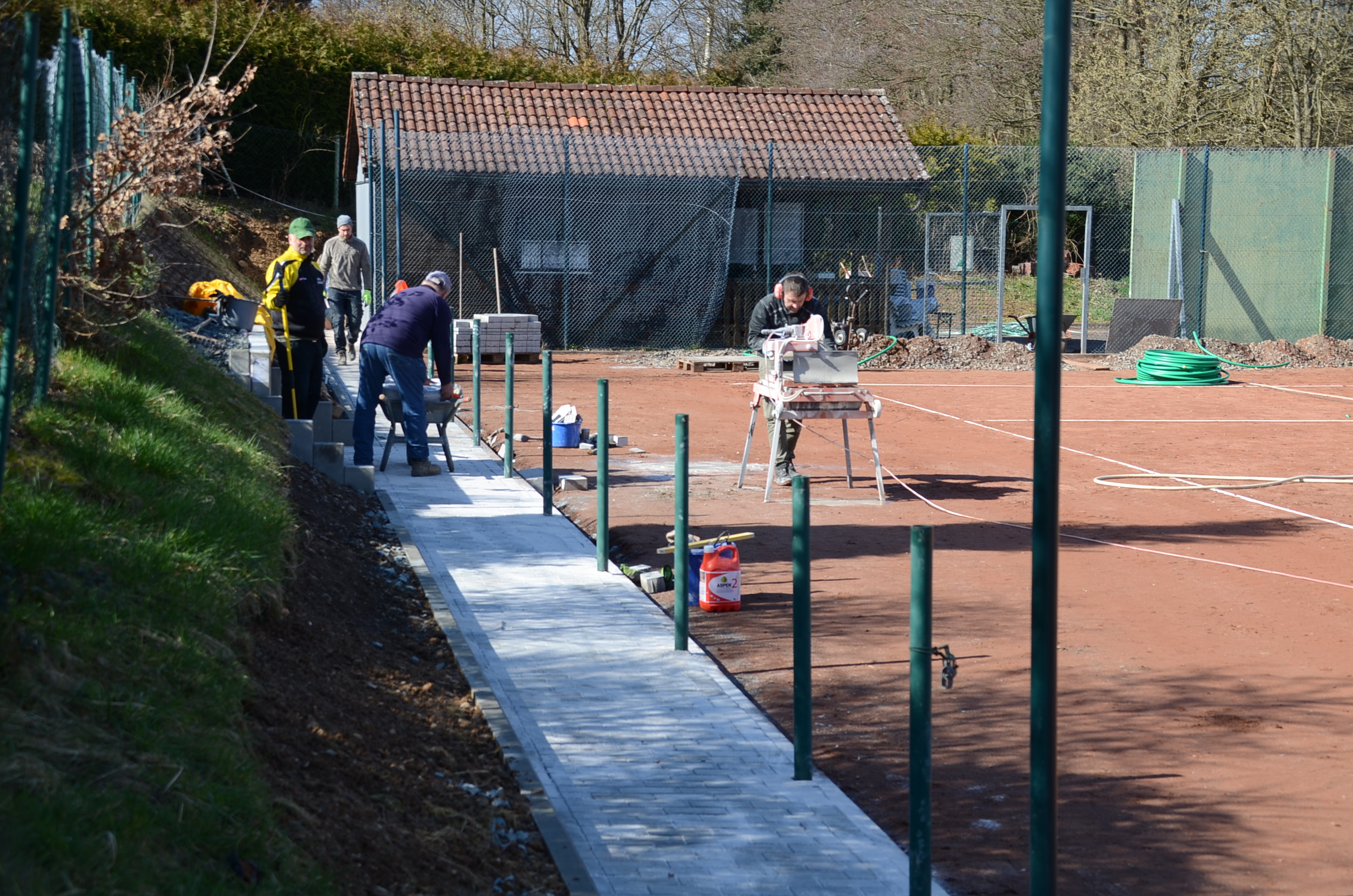 Mit vereinten Kräften wurde der an den beiden Spielfeldern vorbeiführende Gehweg komplett in Eigenleistung verbreitert, neu gepflastert und Nischen im Hangbereich mittels L‑Steinen angelegt. Der Durchgang hinter der Tennishütte musste zwecks Durchfahrtsmöglichkeit mittels Schubkarren und besserer Begehbarkeit verbreitert werden. Es wurden bewehrte Betonelemente eingebaut. Derzeit wird eine neue automatische Beregnungsanlage für beide Tennisplätze in Eigenleistung eingebaut. Sobald diese im Grundbau erforderlichen Arbeiten abgeschlossen sind, wird die Tennissparte in Eigenleistung den Oberbelag samt Linierung in Ziegelmehlaufbau auf beiden Plätzen in Angriff nehmen.
