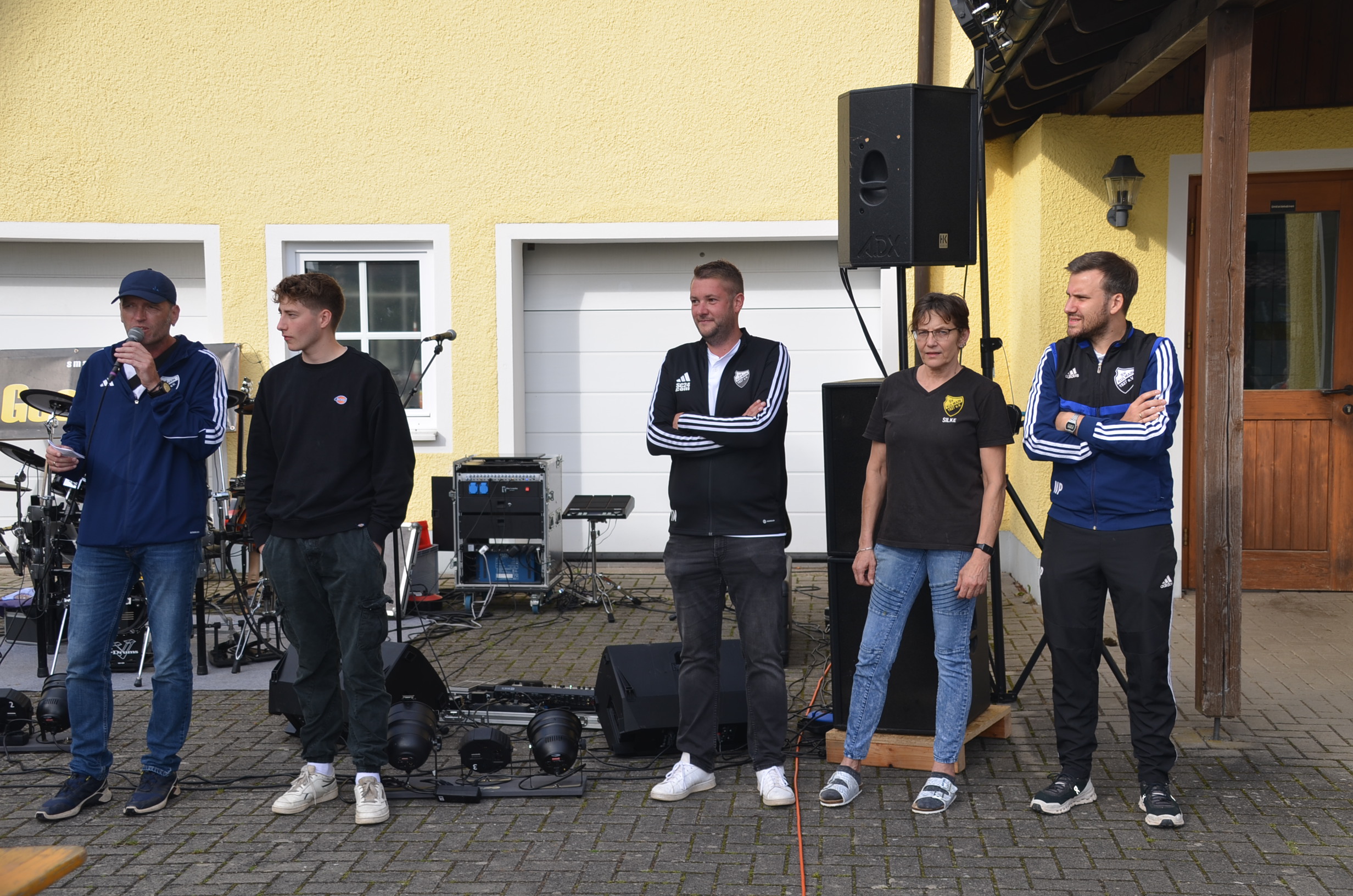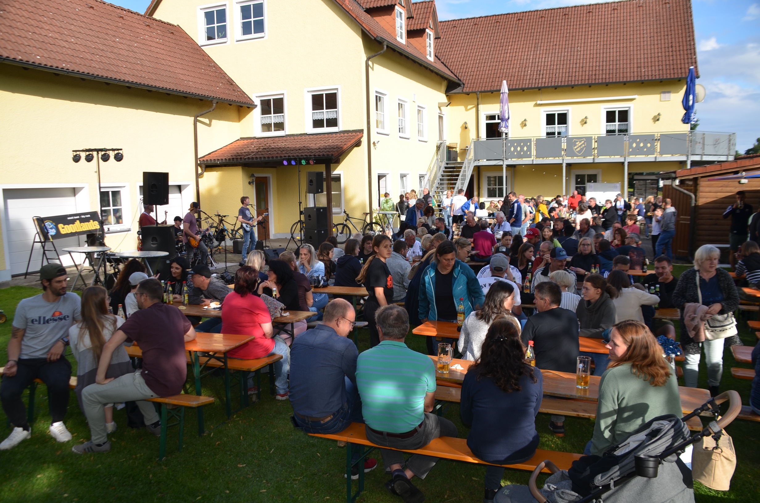 Während die Letzten noch duschten, startete der Aufbau für den musikalischen Event des SV-Sommerfestes. Eine der angesagtesten Kultbands der Nordoberpfalz baute vor den Gerätegaragen ihr Instrumenten‑, Lautsprecher- und Verstärkerequipment auf. „Es wird schon gut gehen mit dem Wetter, ein Zelt haben wir für uns nicht eingeplant“, war sich Drummer Dr. Ralf Cronenberg für die fünfstündige Rockperformance nicht ganz sicher. Doch das Open-Air der Band „Goodlands“ war von Anfang bis Ende in trockenen, erfolgreichen und zuletzt sogar sonnigen Tüchern.
