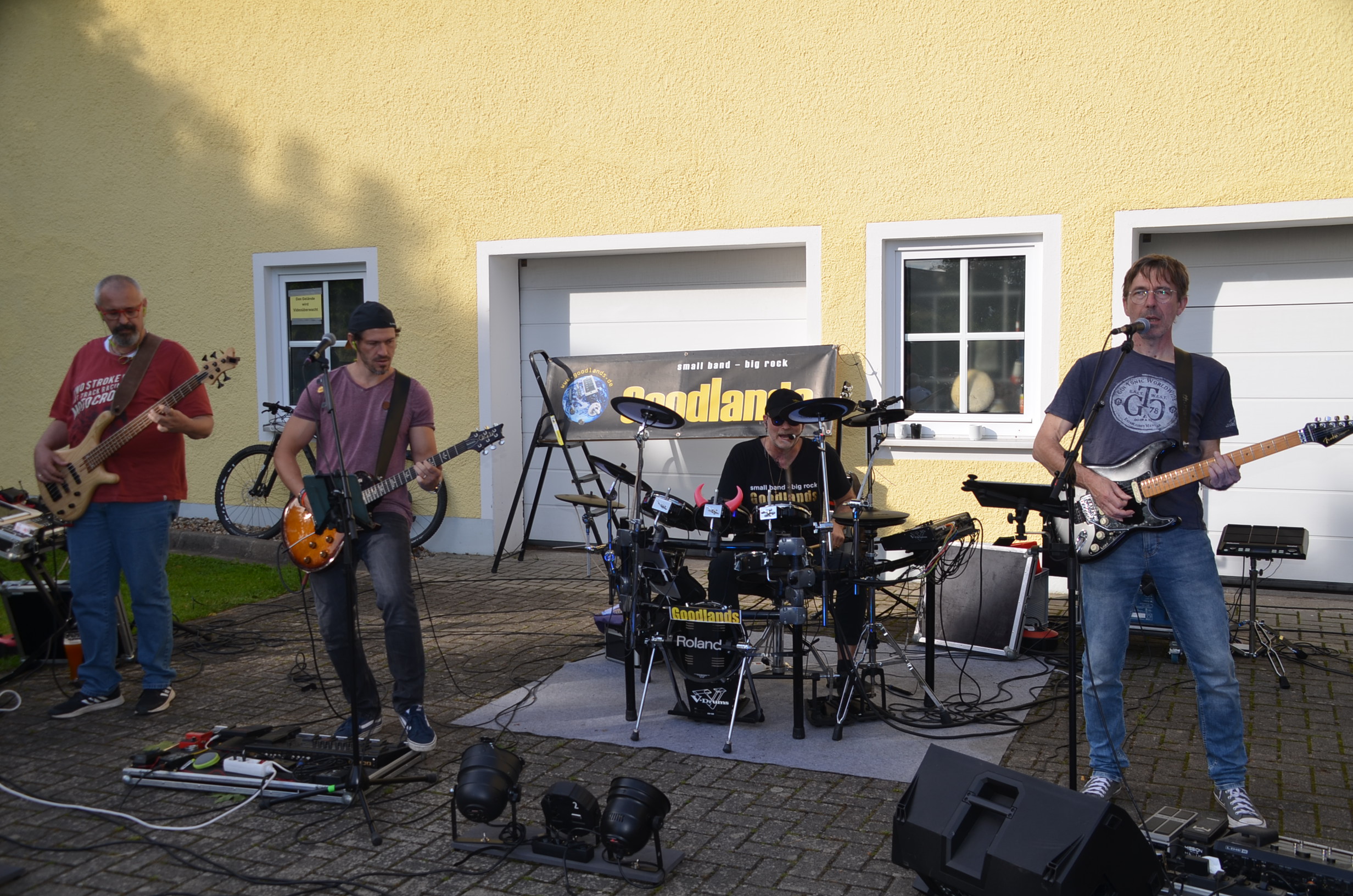 Ab 17 Uhr kam die Rock&Roll-Party im sich stetig füllenden SV-Eventbiergarten mit wachsender Geschwindigkeit ins Rollen. Mit dem Starter Gimme all your lovin’ von ZZ Top gaben die vier „Bewohner der Rockinsel Goodlands“ die musikalische Richtung für die nächsten fünf Stunden vor. Die vier Vollblutrockmusiker im Spaßmodus trumpften mit Musik für Jung und Alt mit fetzigem Live-Rock unter freiem Himmel zum Ausklang des Sommerabends auf. Die Band mit dem Untertitel „Small Band – Big Rock“ mit Drummer und Leadsänger Dr. Ralf Cronenberg, Manu Roder am Bass, Andreas Demleitner und Bernd Kowalevski an den Saiten nahmen die Zuhörer auf den Highway to Hell der Rockmusik ergänzt mit aktuellen Stücken im Hardrocksound der Vinyl-Ära mit.