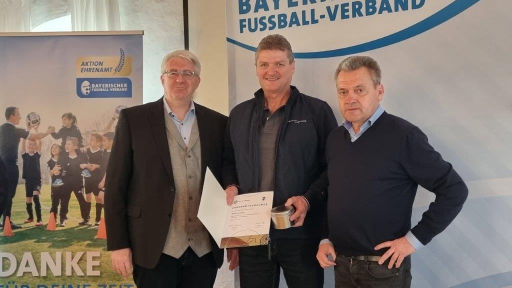 Bild v.l. Thomas Graml (Bezirksvorsitzender), Michael Bodner, Manfred Schwabl (Präsident der SpVgg Unterhaching)