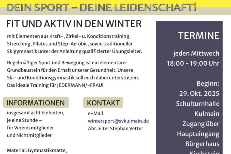 Gut gerüstet in die neue Wintersport-SaisonFit und Aktiv in den Winter An alle Couch-Potatoes und natürlich auch Fitnessbegeisterten! Wir starten mit unserer Ski- und Konditionsgymnastik am Mittwoch (!), 29. Okt. 2025 um 18 Uhr! ALLE INFOS kurz und kompakt in unserem Flyer! Kontakt/Rückfrage zur Skigymnastik 2025